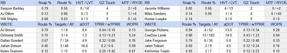 Noise: Jalen Hurts — 9 scrambles, 4.9 passing aDOT; A.J. Brown, DeVonta Smith — 4 combined targets; Jahan Dotson — 0.59 WOPR; Saquon Barkley — 3.3 YPC (+8 RYOE); George Pickens — 0.28 WOPR (omits a long target where he drew a DPI, also doesn’t accurately reflect he was clearly part of the in crowd with a small group of target-earners in the downfield passing game); CeeDee Lamb — drops