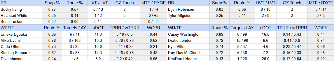Noise: Cade Otton — no catches (73% routes are solid for a TE); Bijan Robinson — only a 12 to 10 rush attempt edge over Tyler Allgeier (Bijan still played 83% and got all 7 RB targets, though the 50/50 split in green zone touches is something to watch as a legitimate potential issue); Drake London — 53% catch rate, 3.7 YPT (buy the 15 targets)