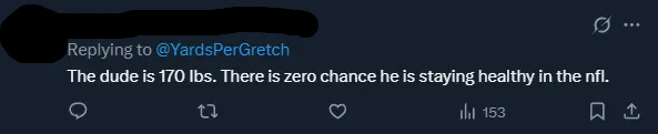 When I see Hollywood Brown look like he’s just woken up from a Jason Bourne coma and is relearning how to play football for the first half and then still go 10-for-99 running Xavier Worthy’s routes, I’m pretty OK with the decision to take a lighter WR who happens to be the fastest player in combine history. When people have said he can’t hit the big plays and sucks, I’ve said, “You better be right,” because I didn’t know what was going to happen, but it sure seemed like it was going to work out pretty well in most cases.