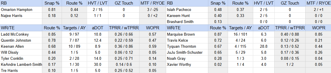 Signal: Chargers — +15.2% PROE (this specific number won’t stick, but there’s a hint at a passing shift that could be very impactful); Justin Herbert — flashed his mobility, was electric as a passer, and looks like a huge upside late-round QB; Omarion Hampton — 81% snap share, 44% routes, but also just 2 HVTs in a game with 34 pass attempts (the concern coming in was the offense making him into a TRAP back, and that showed); Travis Kelce — 10.3% target share (limited work despite real need); Hollywood Brown — huge volume covering for Xavier Worthy in the gameplan; Isiah Pacheco — 48% snaps, 37% routes (in a split, will have some potential to see usage grow in short term but pretty TD-dependent overall)