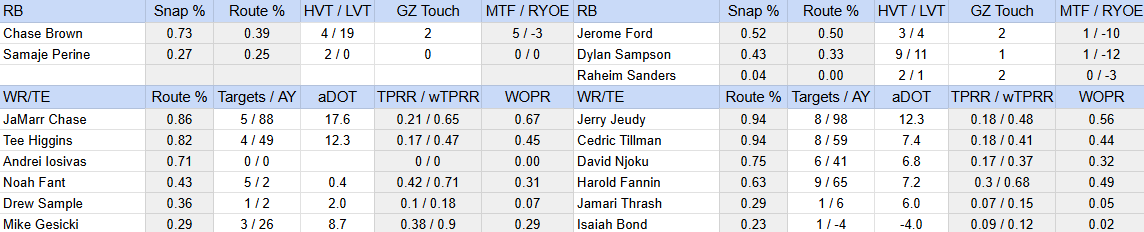 There’s not a lot else to say about a team with so little production. We did at least see concentration of the offense, even as the low volume makes some of the ancillary usage look more significant than it is. Chase Brown (21-43-1, 3-2-8) got a ton of work early, and his 73% snap share was very good to see. Tahj Brooks only played on special teams, but Samaje Perine (2-2-6) was a bit of a nuisance on pass downs. Still, this was a strong Brown result for Week 1. He should get a ton of work.