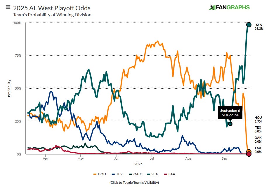 Here’s Fangraphs’ chart of our odds to win the division, which was at 22.9% on September 6 despite Fangraphs having a really strong rest-of-season projection for our wins and losses in their model at all points since the All-Star Break (I’d been clinging to that when things were looking bleak).