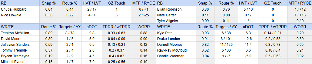 Ray-Ray McCloud (5-2-20) got more involved as well, as Charlie Woerner (1-1-(-5)) had missed two practices last week and only played 14 snaps. A week after playing alongside Woerner, Pitts got heavy usage again, mostly as the TE in Woerner’s absence. The common theme here seems to be a real commitment to a lot of Pitts snaps.