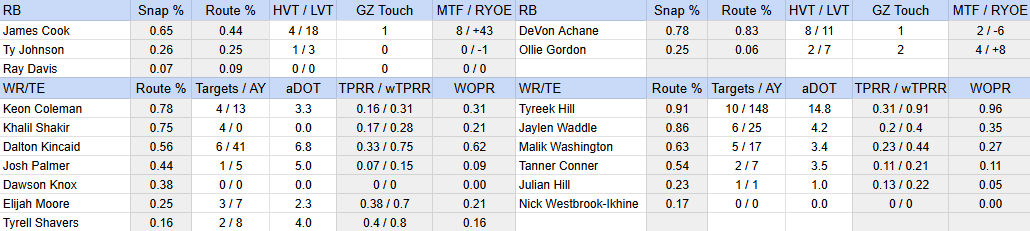 In a game where Jaylen Waddle (6-5-39-1) came in questionable and felt like he wasn’t very involved for most of the night, Tyreek Hill (10-5-49-1) saw a ton of volume, but struggled to find the deep connections with Tua. His 148 air yards and 0.96 WOPR speak to there being big play potential, but he only amassed a 4.9 YPT on the 10 targets.